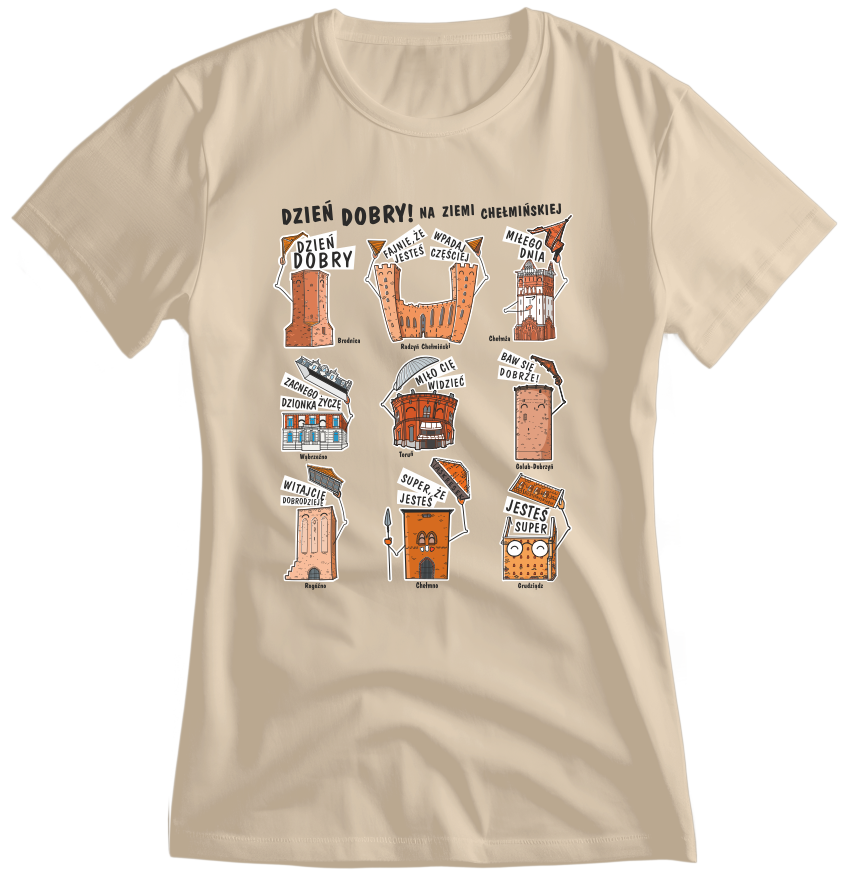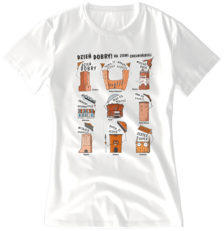 Koszulka z ziemi chełmińskiej to zbiór wyselekcjonowanych miejsc – zabytków – które symbolizują miasta regionu. Jesteśmy pewni, że gdyby budynki mogły mówić, przywitałyby się na samym wstępie naszego zwiedzania. Dla kogo? Dla wszystkich miłośników tego regionu jak i podróży! To koszulka dla turystów, koszulka dla regionalnych patriotów, to koszulka dla fanów zwiedzania.